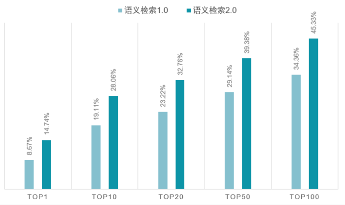 从以上测试结果图表可以看出,语义检索2.0在一些IPC分类上,相较于1.0有较为显著的提升,例如G01、A61、C08、C09、A01等,Top1可达6%以上的提升,Top100可达15%以上的提升,其他分类在Top1也至少有2%的效果提升,在Top100至少有5%以上的效果提升。使用语义检索2.0,有7个IPC分类在Top1的X文献检出率可达13%以上,最高可达21%,有8个IPC分类在Top100的检出率可达41%以上,最高可达56%。